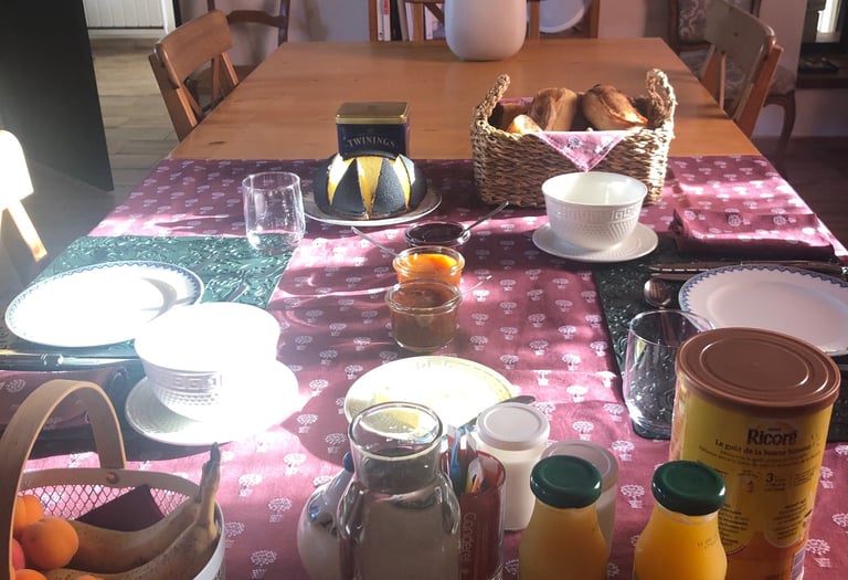 Le petit-déjeuner est inclus dans le prix de la chambre d'hôtes. Pour les gîtes, possibilité de réserver un petit-déjeuner au prix de 7,00€ par personne, déposé à votre porte sous forme de panier à l'heure qui vous convient.